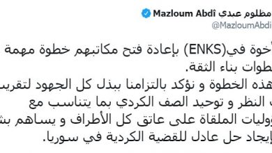 وصف القائد العام لقوات سوريا الديمقراطية إعلان المجلس الوطني الكردي إعادة فتح مكاتبه في روج آفا بـ “خطوة مهمة في…