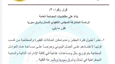 أصدرت الإدارة الذاتية لشمال وشرق سوريا عدة قرارات جديدة تهدف لتأمين احتياجات المواطنين وخاصة العوائل التي تعتمد في كسب قوتها…
