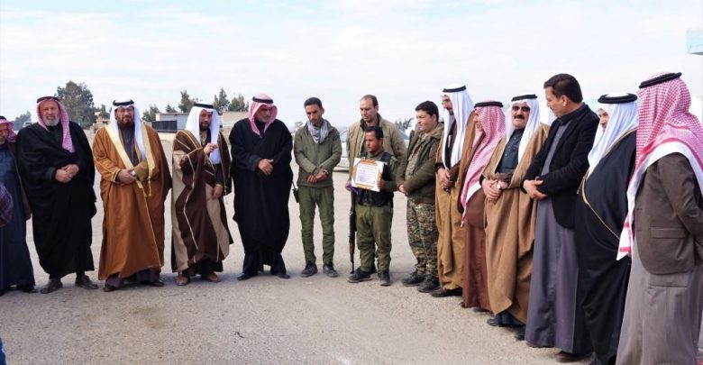 كرّم شيوخ ووجهاء العشائر العربية في منطقة الطبقة وبمشاركة مكتب العلاقات العامة العسكرية لقسد أعضاء حواجز قوى الأمن الداخلي في الريف الشرقي، تقديراً لجهودهم المتفانية في الحفاظ على أمن المنطقة، وثناءً على حسن معاملتهم مع الأهالي.. بحضور العشرات من شيوخ ووجهاء المنطقة وعدد من قياديي قوات سوريا الديمقراطية وبمبادرة من مجلس صلح العشائر تم منح شهادات تقدير لأعضاء حواجز قوى الأمن الداخلي في محيط بلدة المنصورة الواقعة شرق مدينة الطبقة.. وخلال زيارة الحواجز الأمنية بارك الشيخ فواز البيك باسم مجلس صلح العشائر الجهود والمساعي التي تبذلها قوى الأمن الداخلي للحفاظ على سلامة المنظومة الأمنية، ورفع مستوى الأمن والأمان في المنطقة، على الرغم من المحاولات الفاشلة والمتكررة التي تريد النيل من هذه المنظومة التي يجسدها أبناء المنطقة.
