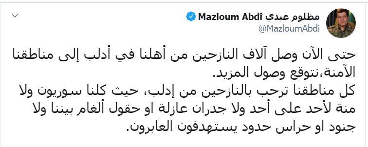 أكد القائد العام لقوات سوريا الديمقراطية مظلوم عبدي وصول الآلاف من نازحي إدلب إلى مناطق سيطرة قسد الآمنة، وتوقع وصول المزيد وجاء ذلك عبر تغريدة نشرها على صفحته في تويتر، قال فيها: “حتى الآن وصل آلاف النازحين من أهلنا في إدلب إلى مناطقنا الآمنة، نتوقع وصول المزيد. كل مناطقنا ترحب بالنازحين من إدلب، حيث كلنا سوريون ولا منّة لأحد على أحد ولا جدران عازلة أو حقول ألغام بيننا ولا جنود أو حراس حدود يستهدفون العابرين”.