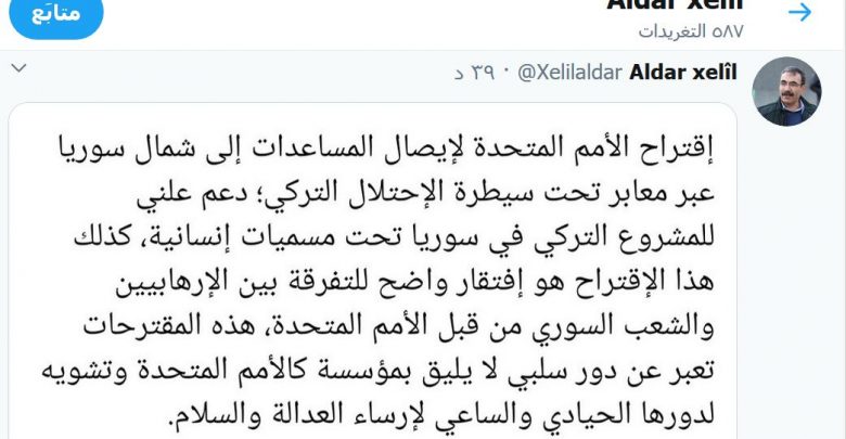 أوضح آلدار خليل أن اقتراح الأمم المتحدة إيصال المساعدات إلى شمال سوريا عبر معابر تحت سيطرة الاحتلال التركي؛ دعم علني للمشروع التركي في سوريا، تحت مسميات إنسانية، وكذلك هذا الاقتراح هو افتقار واضح للتفرقة بين الإرهابيين والشعب السوري.. واقترحت الأمم المتحدة، أمس السبت، استخدام معبر تل أبيض على الحدود بين سوريا وتركيا لإيصال مساعدات للمدنيين في شمال شرق سوريا.. عضو الهيئة التنفيذية لحركة المجتمع الديمقراطي آلدار خليل كتب عن هذا الموضوع على حسابه في موقع التواصل الاجتماعي “تويتر”، أن اقتراح الأمم المتحدة لإيصال المساعدات إلى شمال سوريا عبر معابر تحت سيطرة الاحتلال التركي؛ دعم علني للمشروع التركي في سوريا تحت مسميات إنسانية.. أوضح آلدار أن هذا الاقتراح هو افتقار واضح للتفرقة بين الإرهابيين والشعب السوري من قبل الأمم المتحدة، وقال: “هذه المقترحات تعبر عن دور سلبي لا يليق بمؤسسة كالأمم المتحدة، وتشويه لدورها الحيادي والساعي لإرساء العدالة والسلام”.