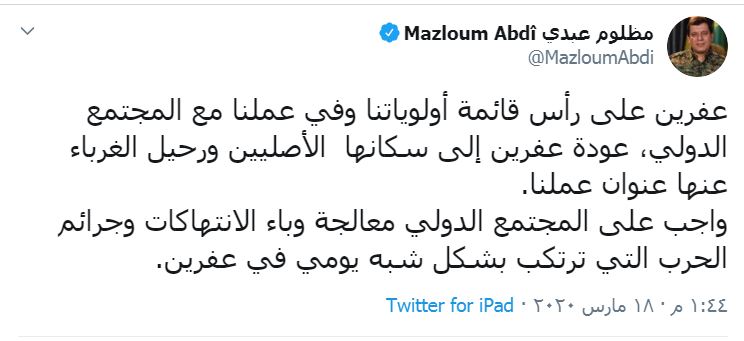 بحلول الذكرى السنوية الثانية على احتلال عفرين، قال القائد العام لقوات سوريا الديمقراطية أن عفرين على رأس قائمة أولياتهم وعودة سكانها الأصليين ورحيل الغرباء عنها عنوان عملهم, وكتب القائد العام لقسد تغريدة على تويتر قال فيها :”عفرين على رأس قائمة أولوياتنا وفي عملنا مع المجتمع الدولي، عودة عفرين إلى سكانها الأصليين ورحيل الغرباء عنها عنوان عملنا”, وأضاف :”واجب على المجتمع الدولي معالجة وباء الانتهاكات وجرائم الحرب التي ترتكب بشكل شبه يومي في عفرين”, يُذكر أنه لازالت تفاصيل الهجمات الوحشية التي شنها جيش الاحتلال التركي ومرتزقته على مقاطعة عفرين قبل عامين في يوم 20 كانون الثاني عام 2018، باقية في ذاكرة من عاش تلك الفترة وخاض تلك المقاومة، وعدم مغادرة الطائرات التركية الحربية سماء المقاطعة، إلا أن المقاومة البطولية التي أبداها الأهالي والمقاتلون أذهلت العالم، وأثبتت تمسكهم بأرضهم واستعدادهم للتضحية من أجلها.