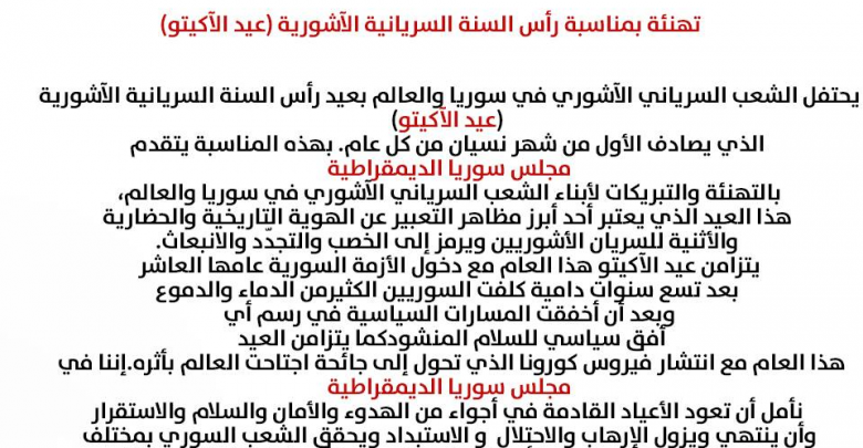 تهنئة من مجلس سوريا الديمقراطية بمناسبة (عيد الآكيتو)