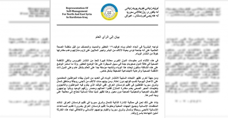 أصدرت ممثلية الإدارة الذاتية لشمال وشرق سوريا في باشور (جنوب كردستان) بياناً إلى الرأي العام تطرقت فيه إلى أوضاع اللاجئين في ظل الظروف والتبعات السلبية لانتشار فيروس كورونا.