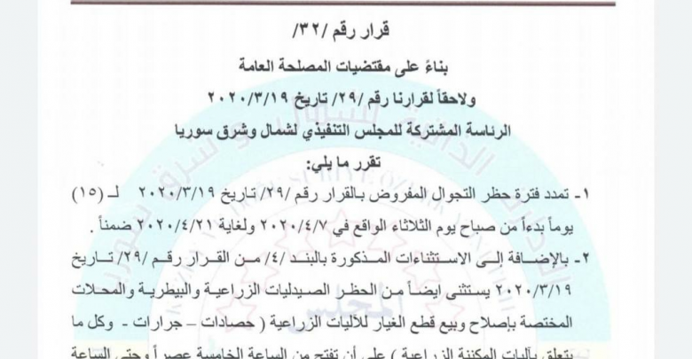 “بناءً على مقتضيات المصلحة العامة ولاحقاً لقرارنا رقم /29/ تاريخ 19/3/2020، الرئاسة المشتركة لمجلس التنفيذي لشمال وشرق سوريا تقرر ما يلي: