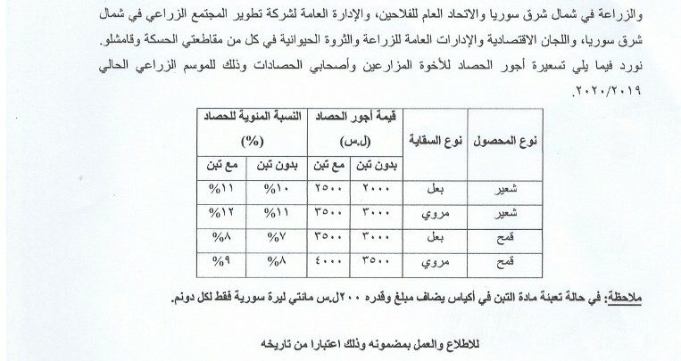 عقب اجتماع موسع عُقد بحضور هيئة الاقتصاد والزراعة في إقليم الجزيرة وهيئة الاقتصاد والزراعة في شمال وشرق سوريا، والاتحاد العام للفلاحين، والإدارة العامة لشركة تطور المجتمع الزراعي في شمال وشرق سوريا، واللجان الاقتصادية، والإدارات العامة للزراعة والثروة الحيوانية في كل من مقاطعتي الحسكة وقامشلو، تم إصدار تعميم حمل رقم /376/. وتضمن تحديد أجور الحصادات.
