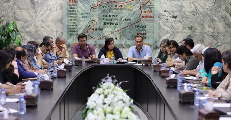 اجتمعت الهيئة الرئاسية للإدارة الذاتية لشمال وشرق سوريا أمس مع المجلس التنفيذي لإقليم الجزيرة، في مقرّ المجلس بمدينة عامودا, الرئيسة المشتركة للمجلس التنفيذي؛ بيريفان خالد نوّهت إلى أن النقاشات ركّزت خلال الاجتماع على “كيفية تلافي مشاكل بعض المواد الأساسية كالخبز، ودعم بعض المشاريع الصغيرة وتطوير الاقتصاد المجتمعي ورفع مستوى دخل الفرد سواء من العاملين ضمن الإدارة أو خارجها وفتح مؤسسات استهلاكية، ومراقبة محال الصرافة ومراقبة الأسعار، ودعم المشاريع الزراعية”، منوهة إلى أن الإدارة الذاتية ستقوم “بإعلان تفاصيل القرارات المتّخذة في الأيام القادمة وستكون هناك حزمة من القرارات والإجراءات التي ستصدر تباعا”.